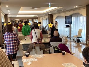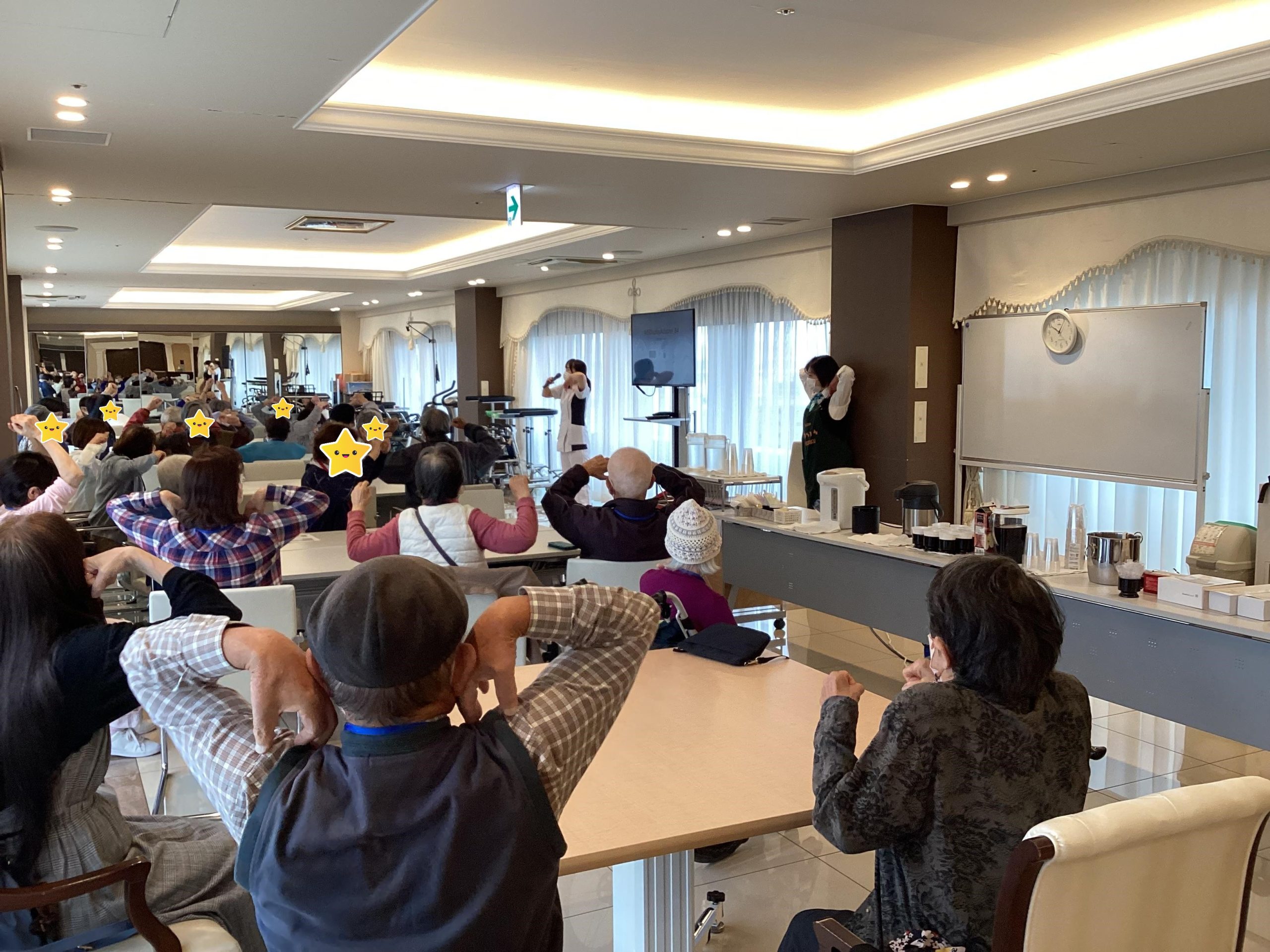 フレイルとは何か、フレイルの基準とは、食べる機能が向上するメンテナンスやトレーニング、バランスの良い食事について分かりやすくお話して下さいました。その他に、食欲が落ちがちな時にもおすすめのレシピについても教えて頂けました。皆様、メモを取りながら真剣に聞き入ってくれていました。また今回は講演の前にリハビリの職員よりご自宅でも安全にできる運動を教えて頂けました。
