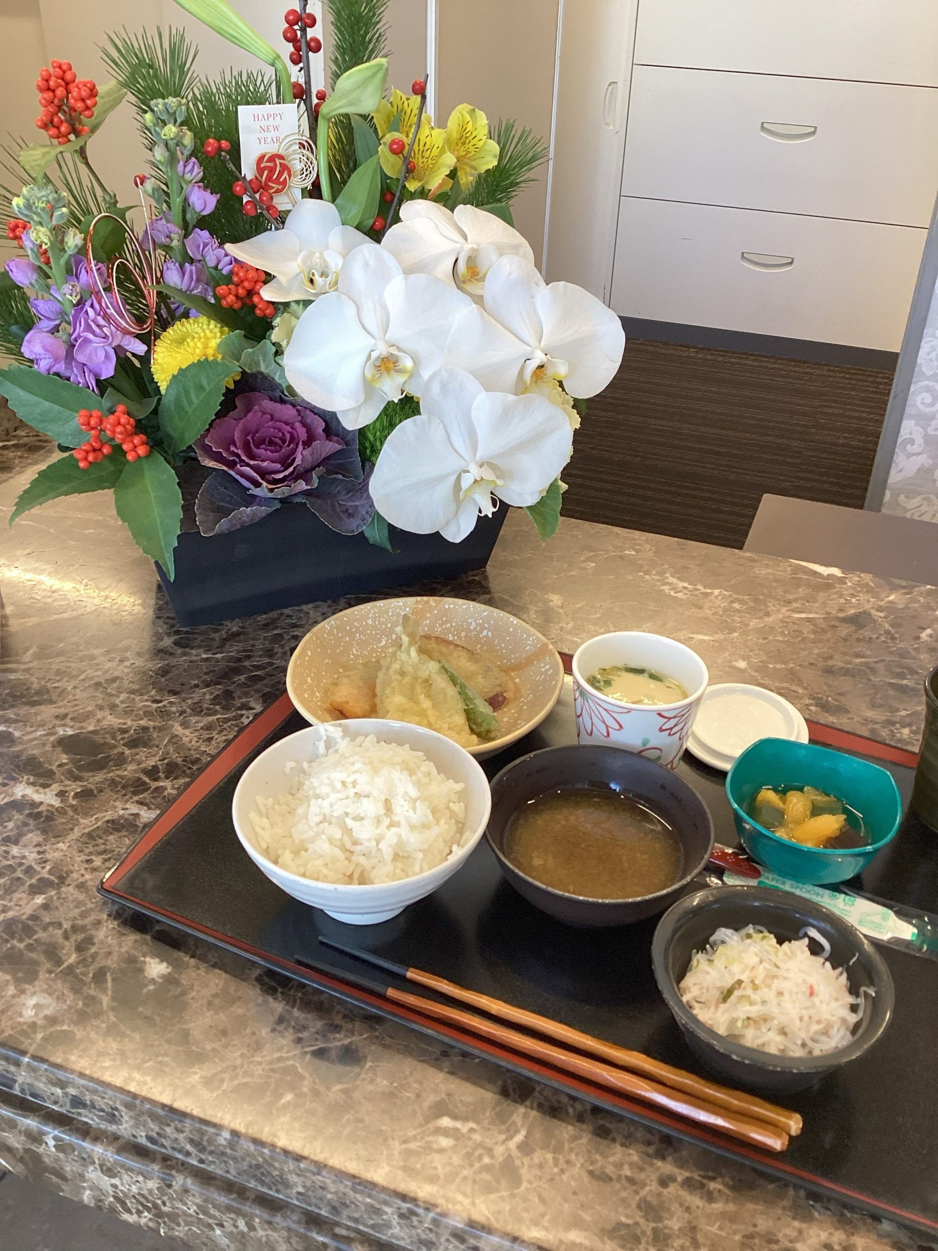 12/31の昼食には天ぷらの盛り合わせ、茶わん蒸しなどを提供いたしました。