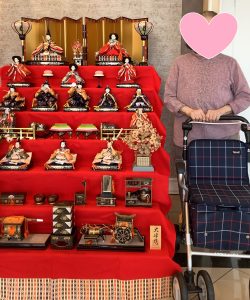 施設では、立派な七段飾りのひな人形をロビーに飾りました