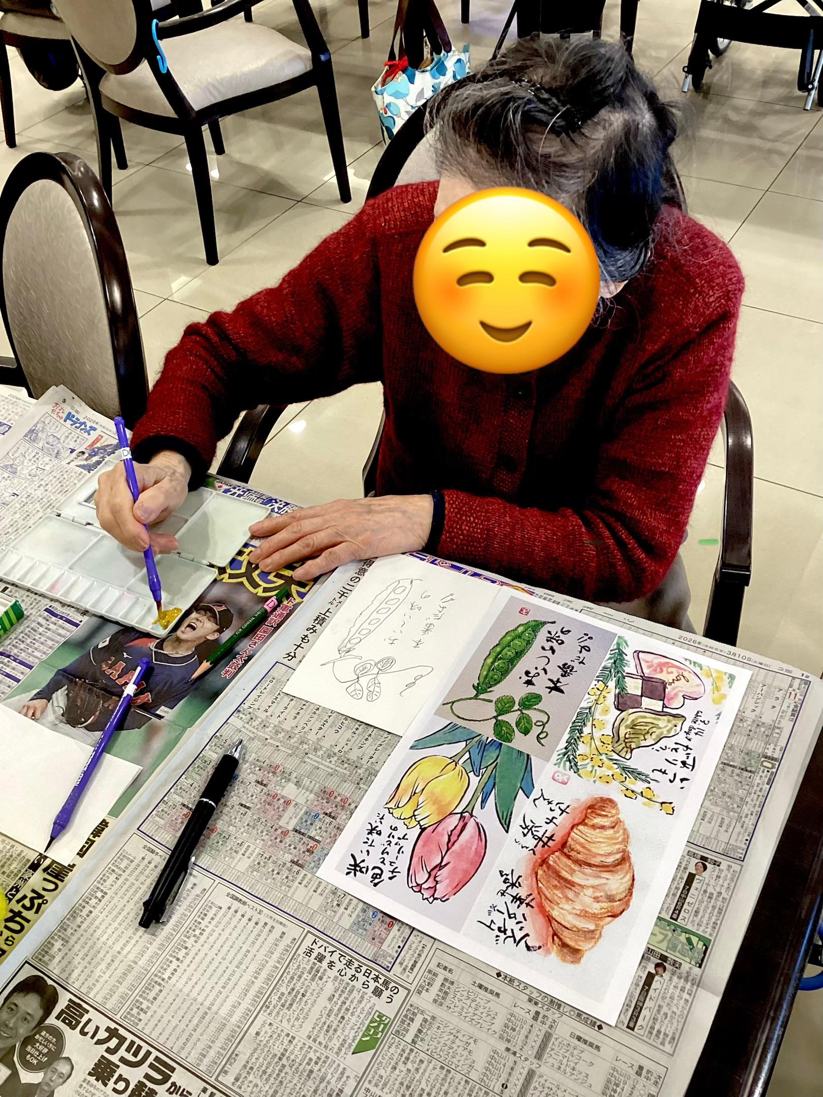 本日のデイケアのレクリエーションでは、絵はがき作りを行いました。お手本を見ながら丁寧に取り組まれる方や、ご自身の思い描いた絵を自由に描かれる方など、皆さんそれぞれの方法で制作されていました。